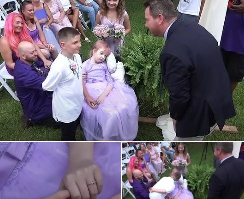 Brave little girl wheeled down the aisle by dad to marry school sweetheart days before passing away